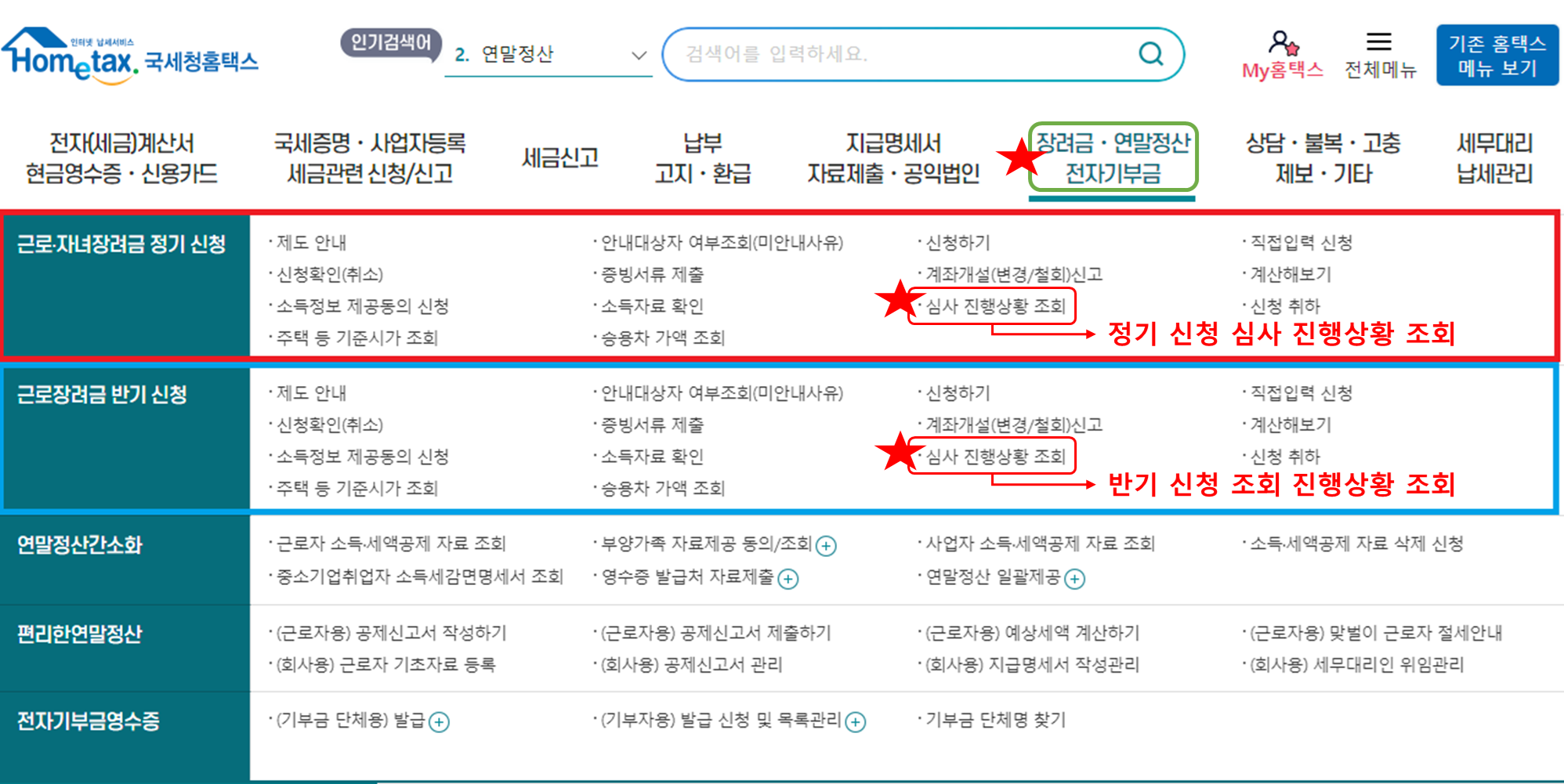 2. 홈택스 메인메뉴의 장려금ㆍ연말정산전자기부금에서 근로 ㆍ 자녀장려금 정기 신청(정기 신청 시) 또는 근로장려금 반기 신청(반기 신청 시)중 해당하는 항목의 심사 진행상황 조회를 클릭 합니다.