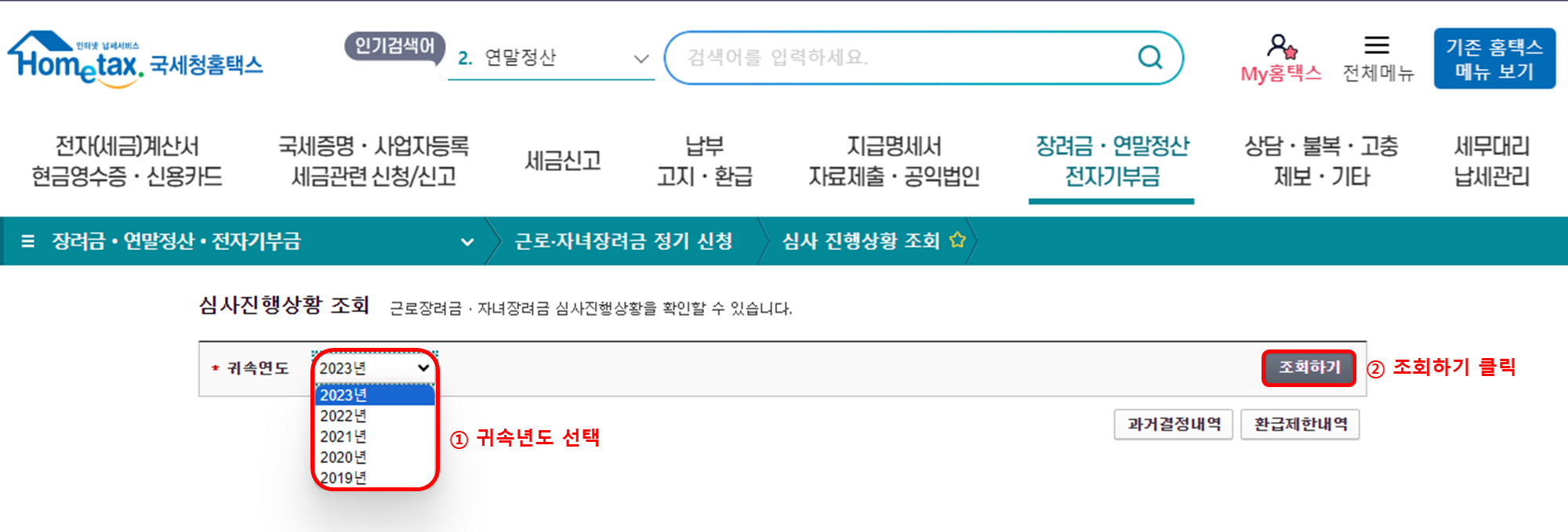 3. 홈택스 심사진행상황 조회에서 귀속연도를 확인하고 조회하기를 클릭 합니다.