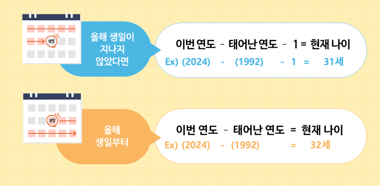 | 올해 생일 이후 | 이번 연도(2024년) - 태여난 연도(1992) = 현재 나이(32세) |