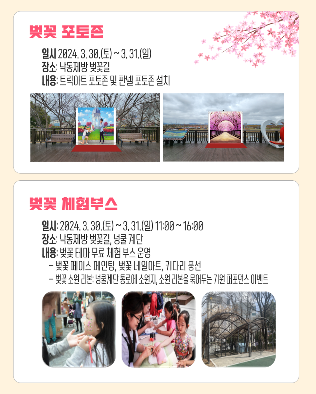- 3.30.(토)~31.(일) / 낙동제방 벚꽃길(벚나들이-버스킹,체험부스,포토존 등)