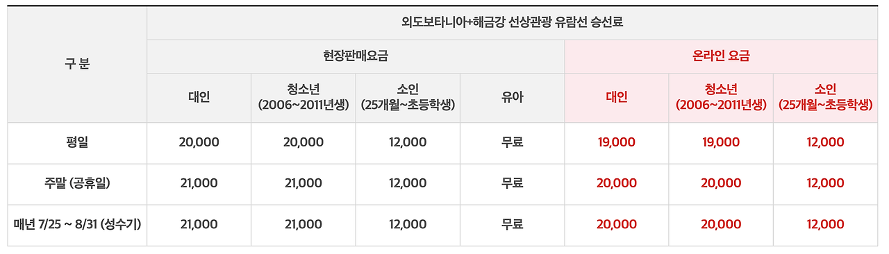 내도 도선 왕복요금 [편도 : 10분 / 승선료는 왕복비용입니다] 구분 대인 중고등 소인 유아 평일 12,000 12,000 10,000 무료 주말 12,000 12,000 10,000 무료