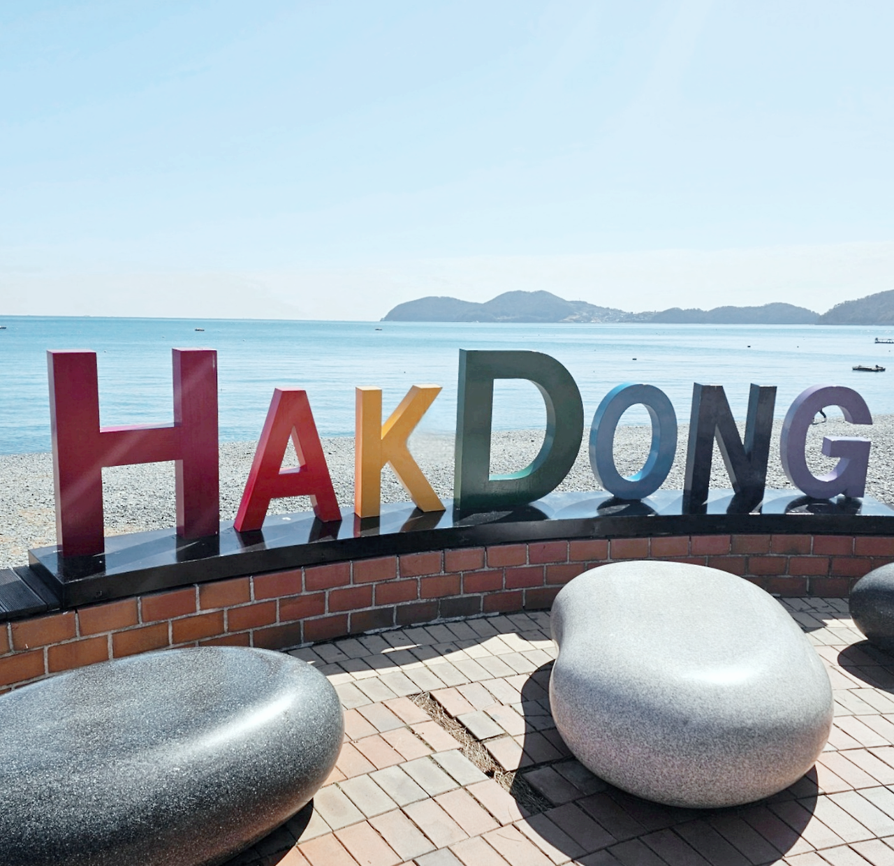 흑진주 같은 검은 몽돌로 이루어진 해변은 전국에서 손꼽히는 명소입니다. 남해안의 맑고 깨끗한 물은 파도를 일으켜 몽돌을 굴러뜨리며 아름다운 소리를 내고, 우리나라 자연의 소리 100선에도 선정된 곳입니다. 입구 등에는 기념사진을 찍을 수 있는 포토 존이 설치되어 있고, 학동의 옛 지명을 따서 이름 지은 그물 오솔길을 따라가면 소나무향과 파도소리가 듣기 좋아서 산책하기 좋습니다.
