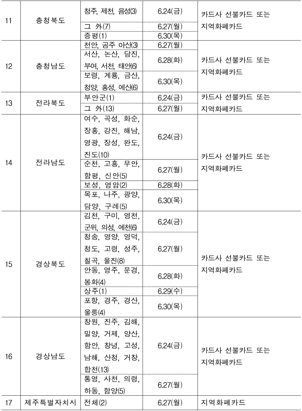 ○ 부산, 대구, 세종 등은 6월 24일(금) 지급을 최초로 시작하며 서울, 대전, 울산, 제주는 6월 27일(월)부터 지급하는 등 나머지 지역도