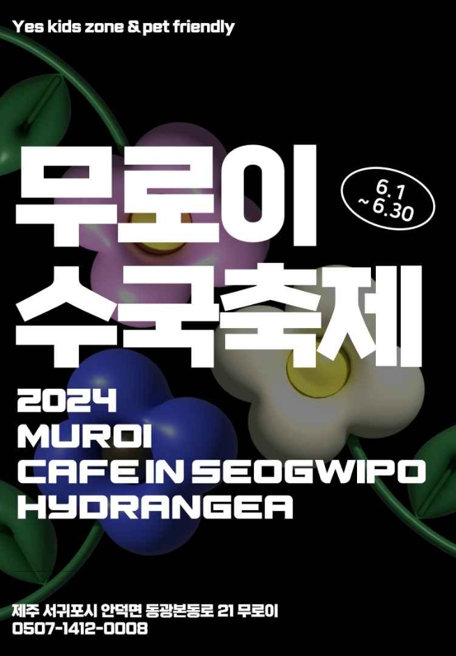 무로이는 서귀포시 안덕면에 위치한 프리미엄 베이커리 카페로, 2024년 6월을 맞아 수국 축제를 개최합니다. 이 축제에서는 형형색색의 아름다운 수국꽃들이 만발하여 방문객들의 시선을 사로잡습니다. 축제 기간 동안 무로이를 방문하시면 화려하게 피어난 수국꽃들 사이에서 여유로운 시간을 보내실 수 있으며, 이를 배경으로 멋진 사진도 찍으실 수 있습니다.