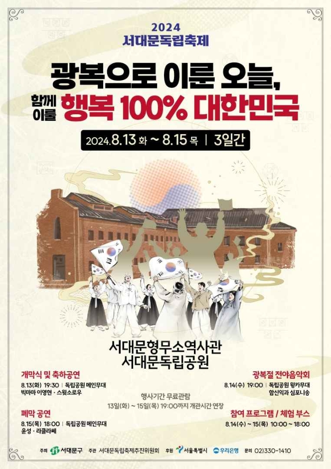 광복 제79주년을 기념하는 2024 서대문독립축제가 8월 13일(화)부터 15일(목)까지 서대문형무소역사관과 독립공원 일대에서 개최됩니다. 이번 축제는 "광복으로 이룬 오늘, 함께 이룰 행복 100% 대한민국"이라는 주제로 다채로운 경축 문화 행사를 선보이며, 광복의 기쁨을 시민들과 함께 나누고자 합니다. 축제는 모두가 하나 되어 행복 100% 대한민국을 꿈꾸는 자리를 마련하며, 다채로운 프로그램과 함께 광복절을 기념하는 특별한 시간을 제공합니다.