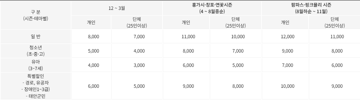| ✅ 위치 : 충남 태안군 남면 우운길 56-19 ✅ 문의 : 041-675-3636 ✅ 운영시간 : 매일 8시30분 ~ 19시 (매표마감 - 6시 / 공휴일,명절 정상영업) ✅ 이용요금 : 위의 안내표 참고. 애완견 입장료(소형견 4,000원 / 대형견 6,000원) |