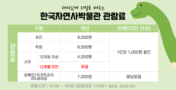 ✅ 위치 : 충남 공주시 반포면 임금봉길 49-25 ✅ 문의 : 042-824-4055 ✅ 운영시간 : 10시~18시 / 정기휴무 - 매주 월,화 ✅ 이용요금 : 어른(9,000원), 초.중.고(6,000원), 12개월이상유아(4,000원) / 공룡만들기(15,000원) ✅ 주차 : 무료 |