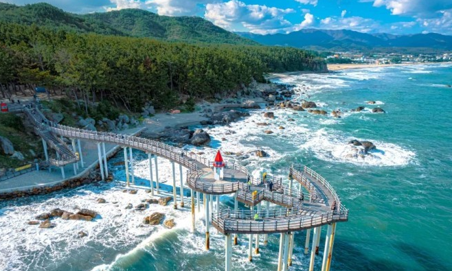 포항의 대표 관광지인 해상스카이워크는 평균 높이 7m, 총 길이 463m로, 국내에서 가장 긴 해상 보도교입니다. 이곳에서는 영일만의 광활한 바다를 한눈에 담을 수 있으며, 맑은 날에는 포항 제철소까지 시원하게 보이는 탁 트인 풍경이 인상적입니다. 투명 유리 바닥 덕분에 마치 바다 한가운데 서 있는 듯한 독특한 경험을 할 수 있으며, 곡선으로 이어진 산책로와 천연 해수풀도 놓치지 말아야 할 명소입니다. 아침에는 일출, 저녁에는 멋진 야경을 감상할 수 있는 이곳은, 투명한 특수유리 바닥 덕분에 바다 위를 걷는 듯한 신비로운 느낌을 제공합니다.
