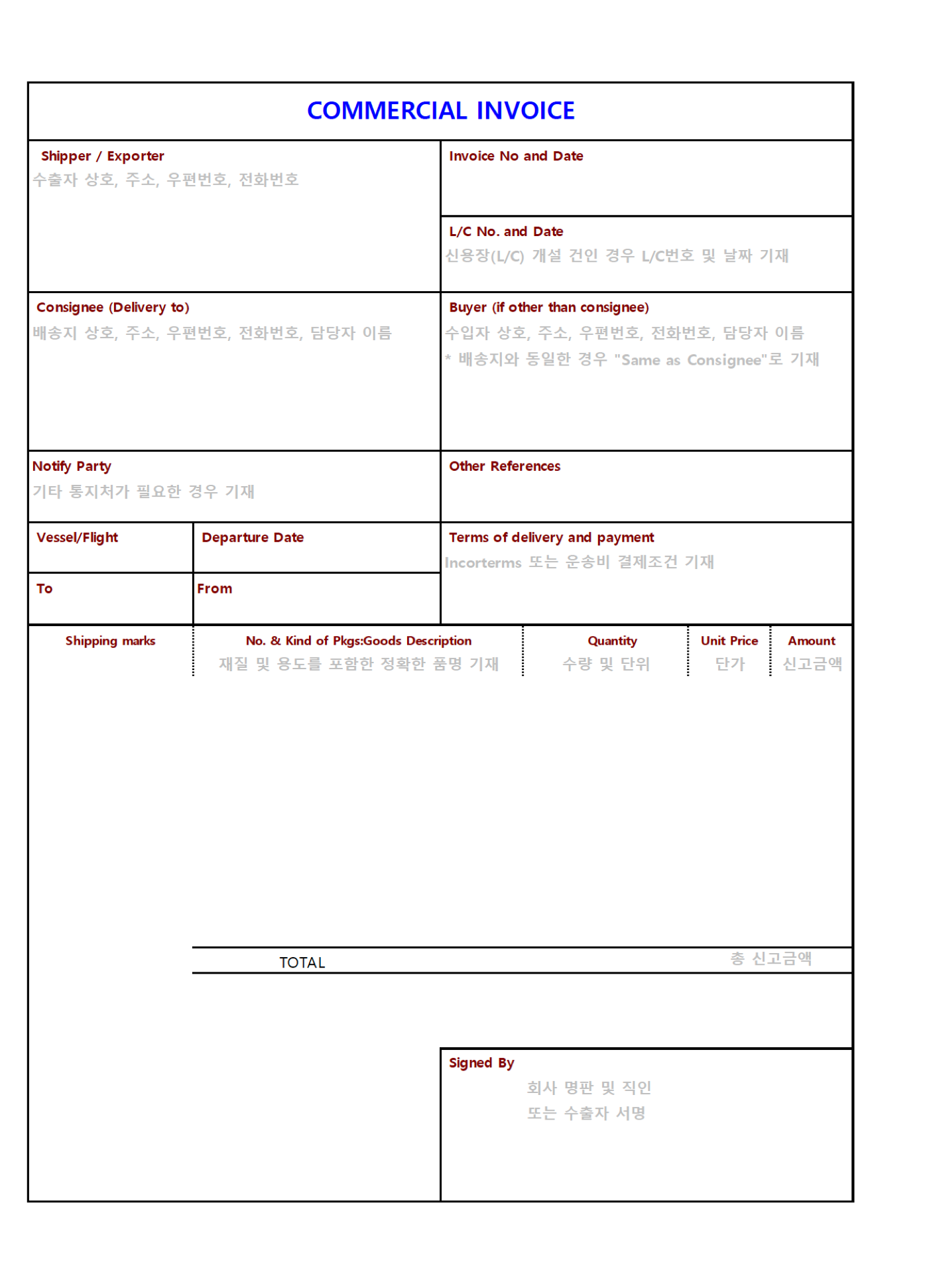 - L/C No. and Date - 신용장(L/C)개설 건인 경우 L/C번호 및 날짜 기재)