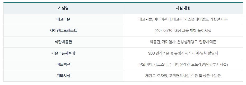 문경에코월드는 기존의 문경석탄박물관과 가은오픈세트장을 에코타운과 야외체험시설 등으로 새롭게 단장하여 충청 이남 최대 규모의 테마파크로 태어났습니다. 백두대간 생태자원을 핵심으로, 친환경 녹색문화를 중심으로 한 문경에서 영상∙문화 콘텐츠를 결합한 생태∙녹색에너지∙환경 테마의 휴양문화공간입니다. 모든 연령층이 함께 즐길 수 있는 다양한 문화 콘텐츠를 제공합니다.