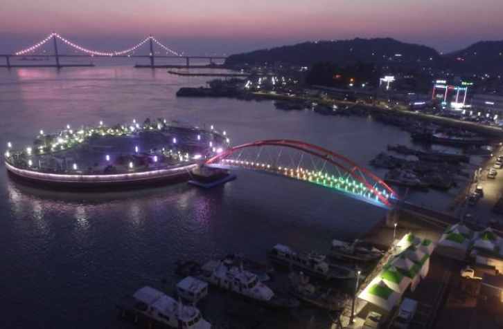 고흥군의 대표 항구인 녹동항에 자리한 바다정원은 면적 5,390㎡, 지름 80m의 인공섬으로, 바다 위에 떠 있는 정원을 형상화한 독특한 공간입니다. 이곳은 아름다운 해안 경관을 바라보며 여유로운 산책을 즐길 수 있는 코스로, 바닥분수, 야외무대, 휴게쉼터, 다양한 조형물이 조성되어 있습니다. 특히 오색빛의 조명으로 물든 야경은 방문객들에게 특별한 감동을 선사합니다. 입구에는 해저와 우주를 탐험할 수 있는 돔 영상관과 VR 체험관이 운영되며, 주말마다 문화예술단체의 공연과 버스킹이 펼쳐져 더욱 풍성한 볼거리를 제공합니다. 매주 토요일 저녁 9시에는 녹동항에서 드론쇼가 열리며, 장어거리 상가의 대형 LED 전광판과 미디어 파사드는 녹동항의 야경을 한층 더 화려하게 만들어줍니다.