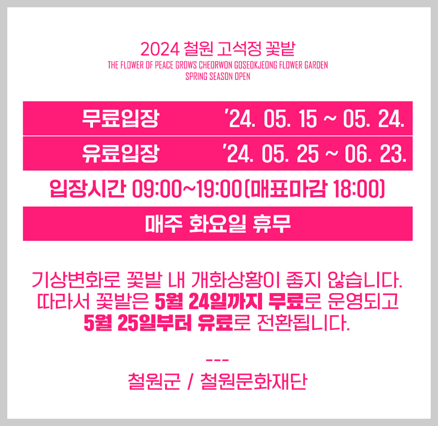 ✅ 고석정꽃밭 안내 주소 : 강원 철원군 동송읍 장흥리 25-203 문의 : 033-450-5059 운영시간 : 9시~19시 (매표마감 18시) / 정기휴무 - 매주 화요일 이용료 : 위의 입장료 안내 표 참고(철원사랑상품권으로 일부 금액 교환 받을 수 있음) 주차 : 정문 건너편에 위치 (무료) |