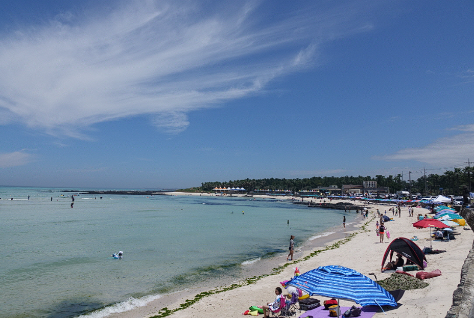 바닥이 훤히 비치는 맑은 물빛과 얕은 수심, 물놀이 후 따뜻한 온수 샤워까지 즐길 수 있는 금능해수욕장은 가족과 함께 방문하기에 최적의 장소입니다. 제주시 한림읍에 위치해 협재해수욕장과 이어져 있어 아름다운 경관을 자랑하면서도 상대적으로 한적한 것이 큰 장점입니다. 주차장에서 해변까지 바로 연결되어 있어 짐 옮기기가 편리하며, 새롭게 마련된 샤워실에서는 온수 샤워도 가능해 쾌적함을 더해줍니다. 간조 시 넓게 드러나는 모래사장과 천연 풀장은 아이들이 물놀이를 즐기기에 안성맞춤입니다. 다만, 조개껍질이 많아 아쿠아슈즈 착용을 추천합니다. 물놀이를 마친 후에는 비양도에 지는 아름다운 노을을 감상하며 잊지 못할 특별한 추억을 만들어 보세요.