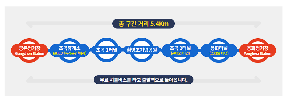 ※ 셔틀버스 운행은 레일바이크 운행 회차에 맞게 운행, 궁촌-용화 간 셔틀버스 운행 시간 20~30분 소요