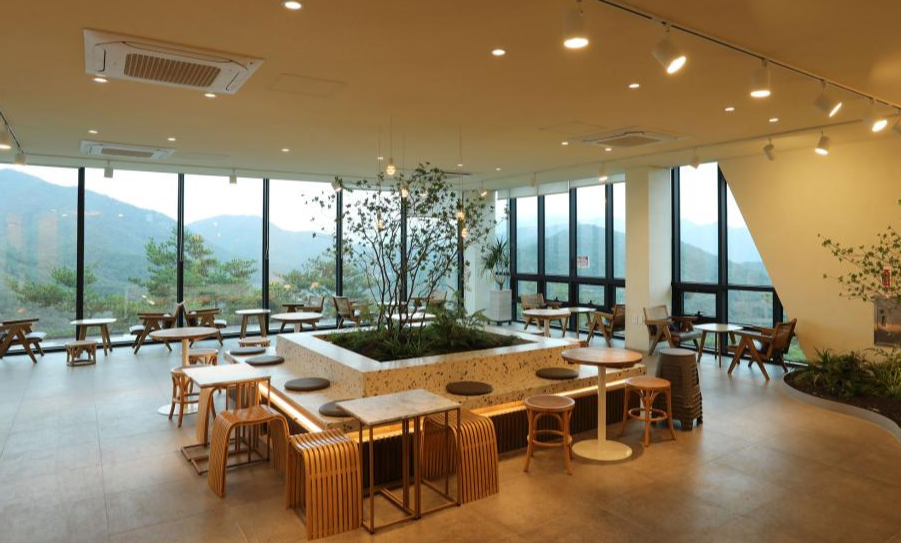 목탁봉 전망대 카페는 속리산 테마파크 모노레일을 타고 올라가야만 도달할 수 있는 특별한 장소입니다. 1층에서 음료를 주문한 후, 야외 테이블이나 2층, 3층 옥상에서 즐길 수 있습니다. 특히 2층은 큰 창으로 속리산의 멋진 경치를 한눈에 감상할 수 있으며, 3층 옥상에는 망원경이 설치되어 있어 더욱 세밀한 풍경을 즐길 수 있습니다. 다양한 베이커리와 함께 제공되는 달콤한 디저트도 있어, 전망을 감상하며 힐링하기 좋은 명소입니다.