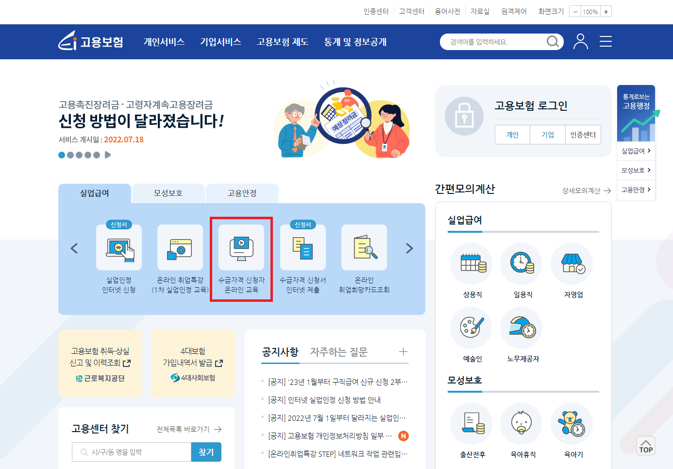온라인 교육을 마쳤으면 다음으로는 수급자격 인정 신청을 받아야 합니다. 온라인으로 신청하는 방법이 있지만 고용보험법에 따라 이직 후 처음으로 구직급여 수급자격을 신청할 때는 고용복지센터(거주지 관할 고용센터)에 방문해야만 합니다.