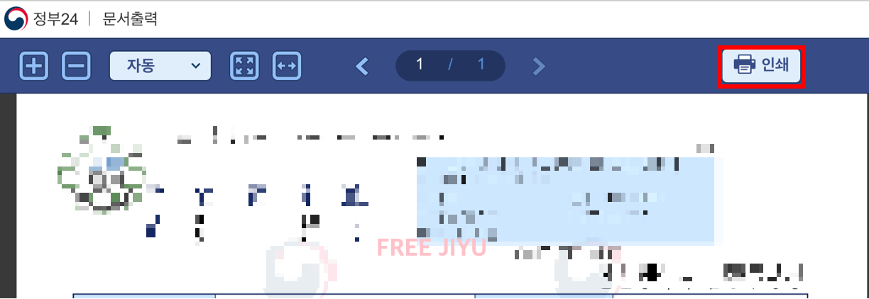 문서 출력 창이 열리며 상단의 인쇄 버튼을 클릭 해 주세요.