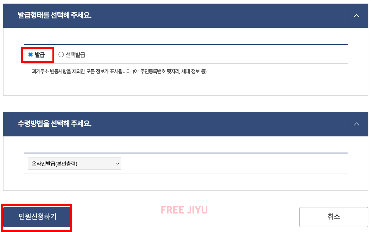 발급 형태는 발급으로 선택 해 주시고, 맨 아래 민원 신청하기 버튼을 클릭 해 주세요.