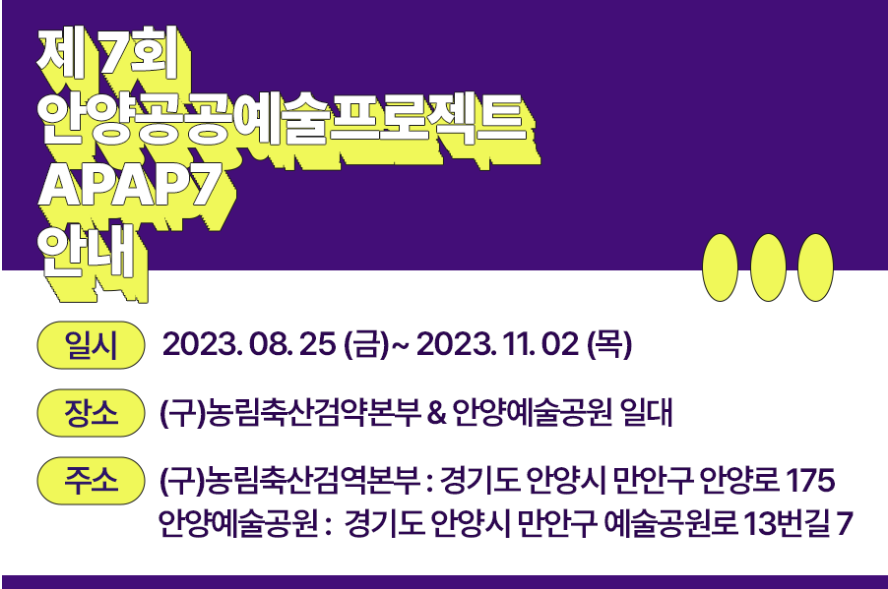 제7회 안양공공예술프로젝트는 국내에서 가장 오래된 공공예술 축제로 (구)농림축산검역본부와 안양예술공원에서 8월 25일부터 11월 2일까지 진행된다.