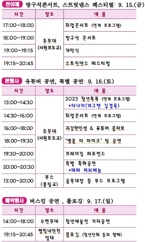 시간 : 전야제 09/15 17:00~21:00, 본행사 09/16 13:00~20:30, 버스킹 공연 9/17 14:00~18:00