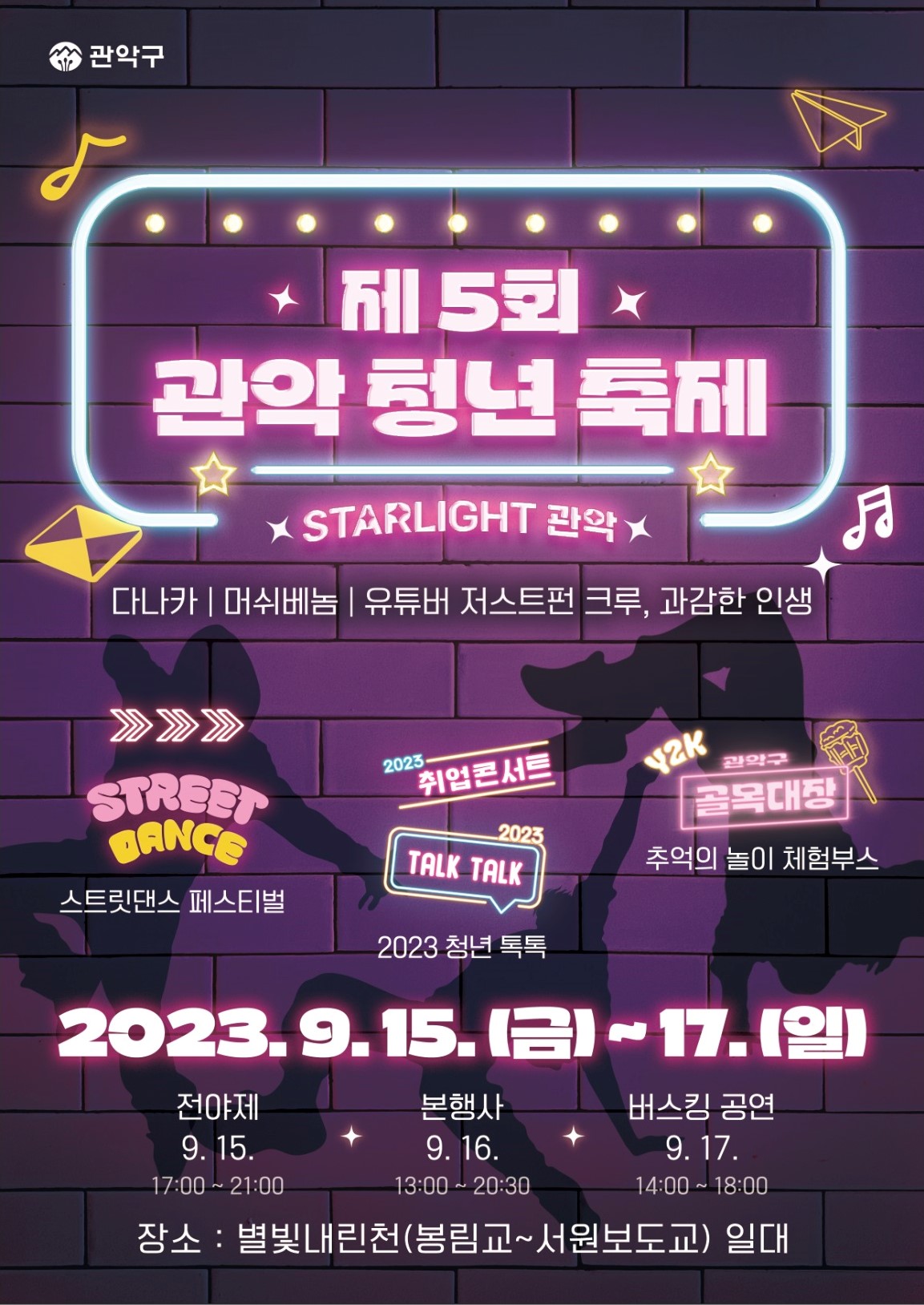 다채로운 볼거리, 즐길거리, 체험거리가 가득한 스타라이트(Starlight) 관악 『제5회 관악청년축제』에 청년분들의 많은 관심과 참여바랍니다.