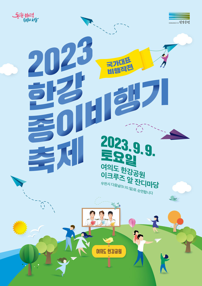 2023 한강종이비행기축제 2023.9.9.(토) 여의도한강공원 이크루즈 앞 잔디마당. 우천시 다음날(9.10.)로 순연합니다