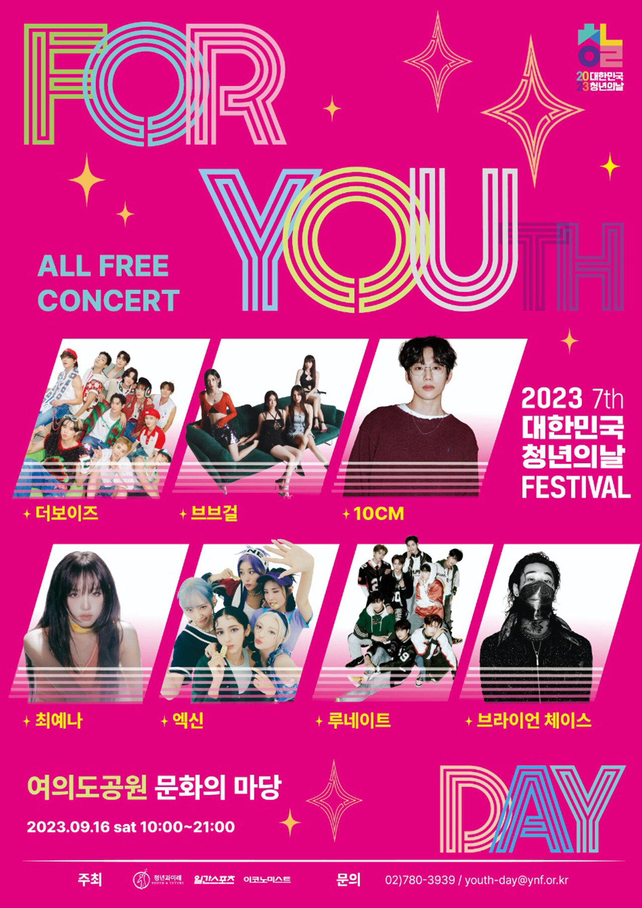 제7회 대한민국 청년의날 K-POP 콘서트 사전신청 23-08-30 18:40 지정 좌석(사전예약) + 현장 참여 스탠딩 - 무료 일 시 : 9/16 (토) 18:00-21:00 장 소 : 여의도공원 문화의 마당 라인업 : 더보이즈, 브브걸, 10