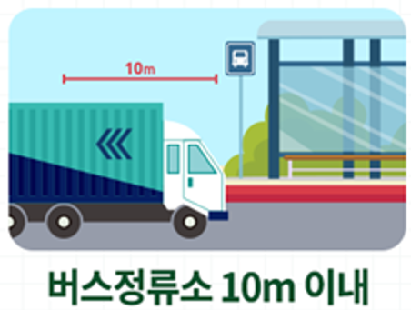 정류소 표지판 좌우 및 노면표시선 기준 기준 10미터 이내 정지 상태 차량 (과태료 : 승용차 4만 원 / 승합차 5만 원)
