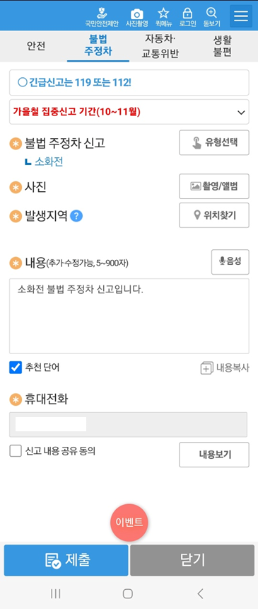 불법 주정차 차량 신고는 안전신문고 앱으로 신고가 가능합니다.
