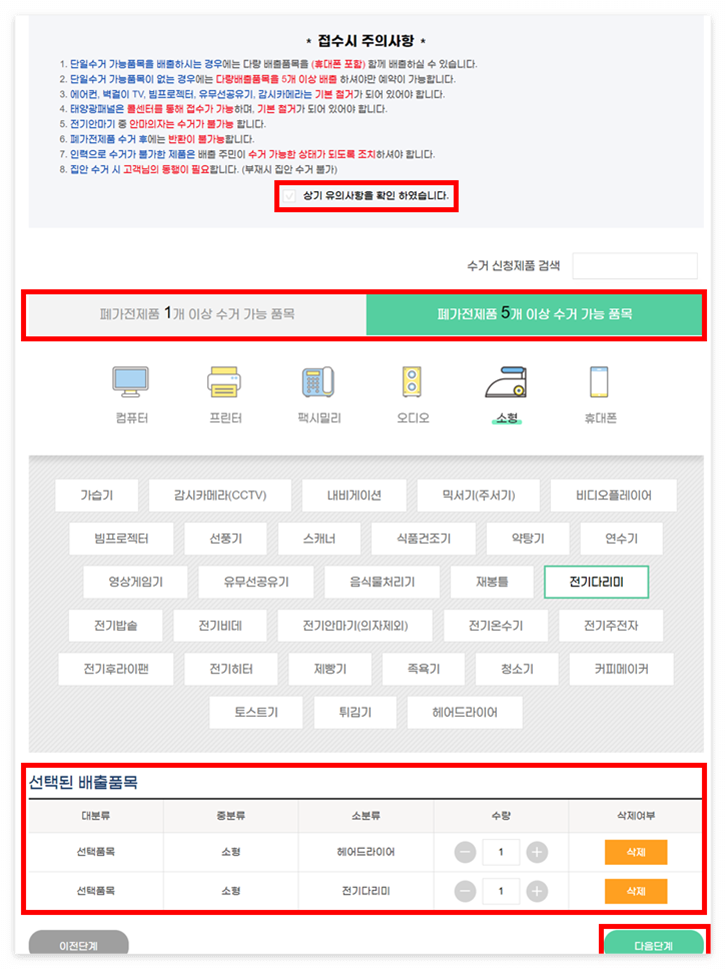 폐가전제품 5개 이상 수거 가능 품목을 선택하면 5개 이상의 폐기제품을 선택해야 합니다.