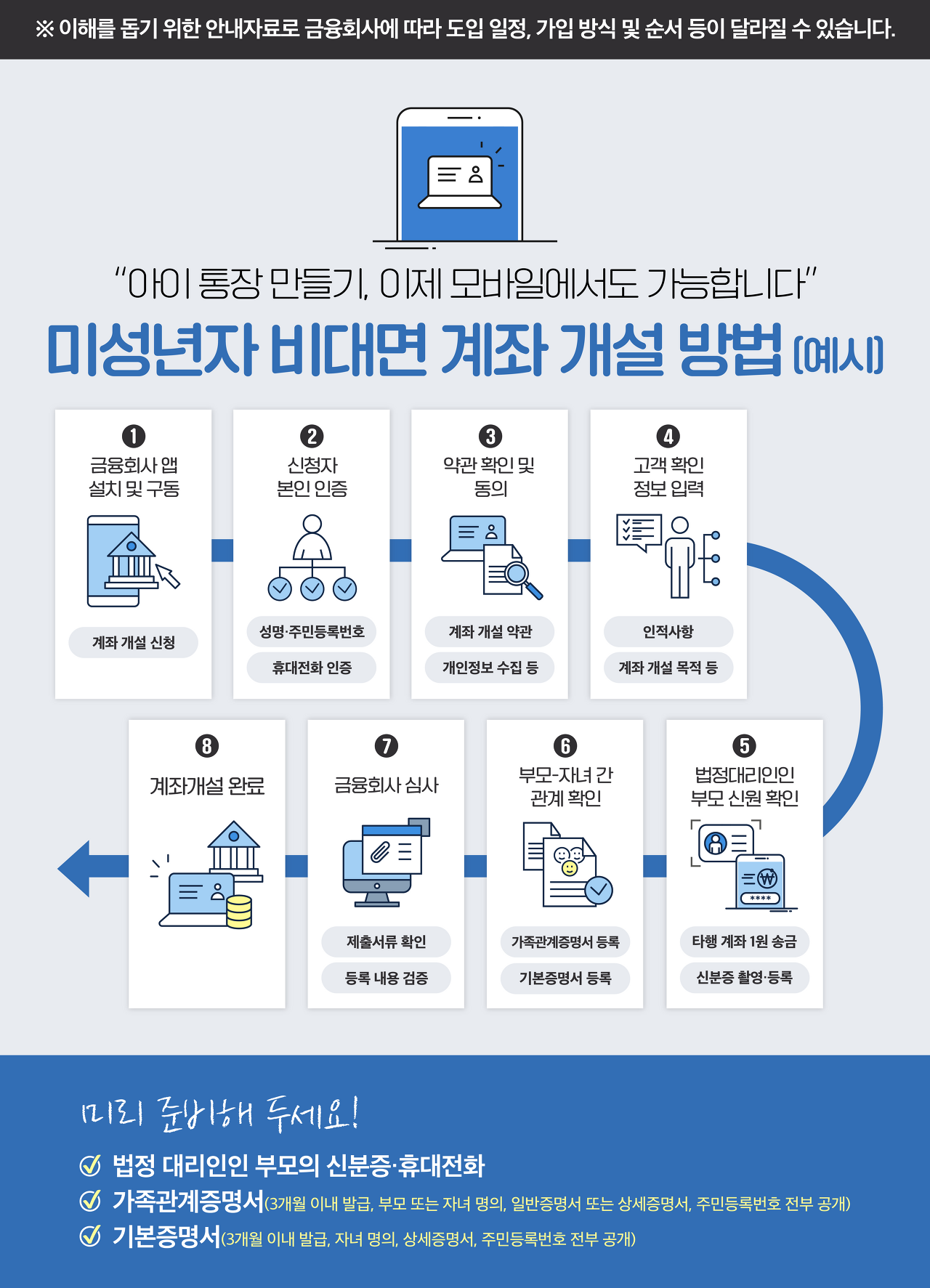 2023년 4월 10일부터 법정대리인인 부모님이 미성년 자녀를 대리해 스마트폰 등을 활용한 비대면 방식으로 자녀 명의의 계좌를 개설하는 것이 가능해졌습니다. 신분증 발급 및 진위 여부 확인 등을 담담하는 기관들의 법정대리인 업무처리 절차도 정비 하였습니다.